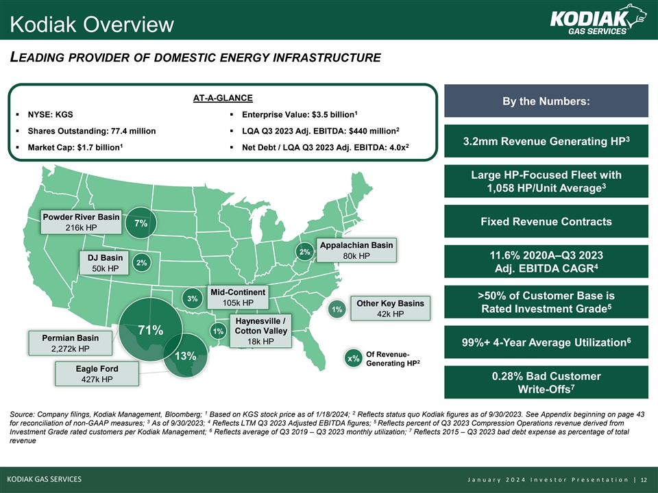 Evolution of Kodiak into Market Leader January 2012 October 2019 May 2010 Kodiak deploys its first two December 2023 Kodiak acquires Pegasus Kodiak Gas Services founded compressors Optimization Managers Kodiak announces CSI acquisition June 2011 February 2019 June 2023 February 2024 Kodiak partners with the Stephens EQT acquires Kodiak from the Kodiak prices ~$294 million 100% Expected $750 million Group Stephens Group primary initial public offering Notes issuance KODIAK GAS SERVICES J a n u a r y 2 0 2 4 I n v e s t o r P r e s e n t a t i o n | 11