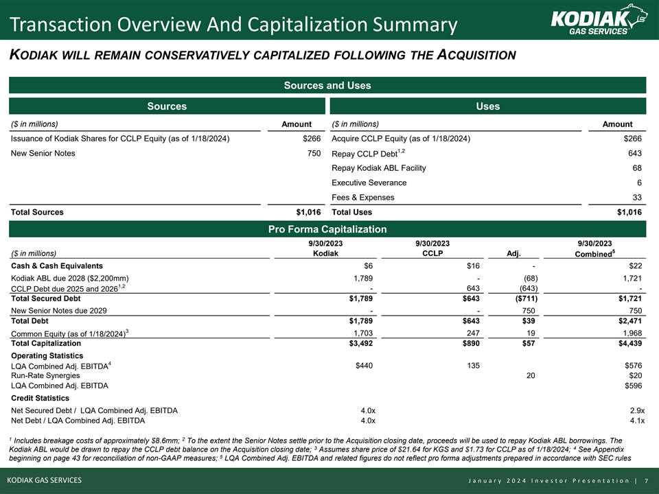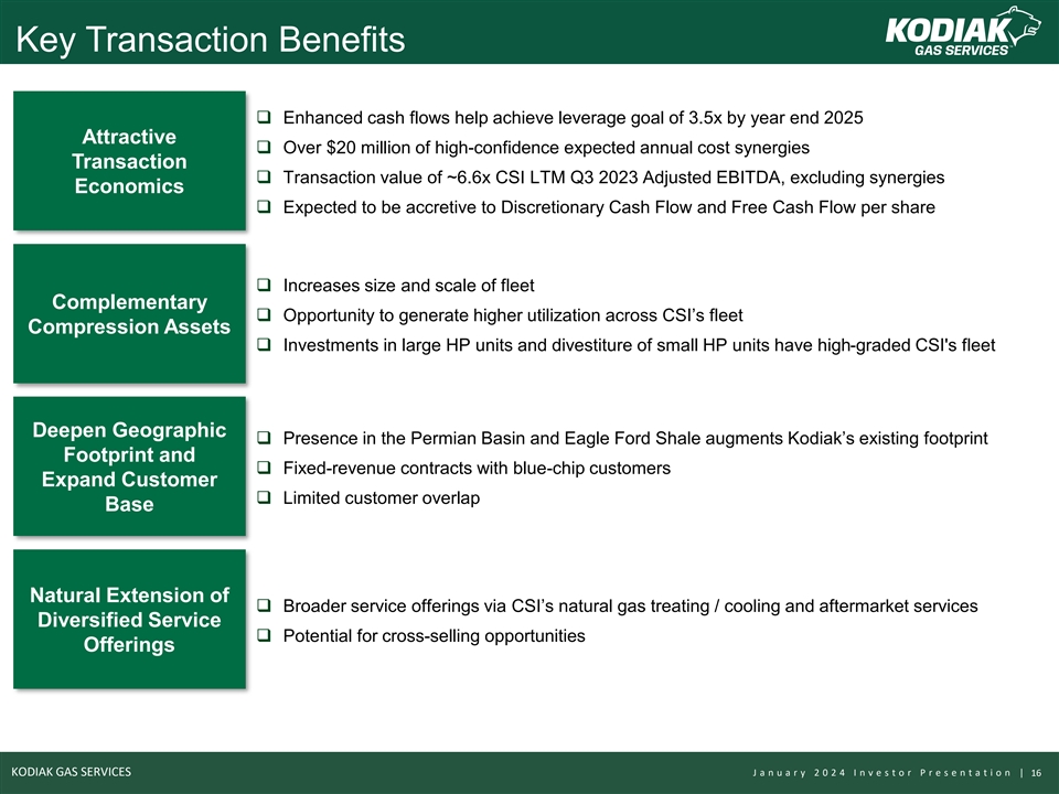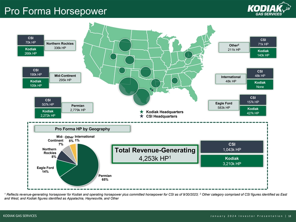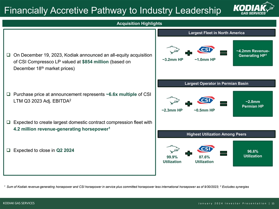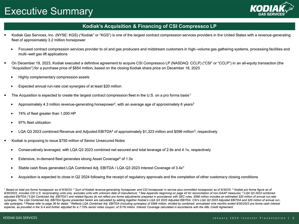 Executive Summary Kodiak’s Acquisition & Financing of CSI Compressco LP Kodiak Gas Services, Inc. (NYSE: KGS) (“Kodiak” or “KGS”) is one of the largest contract compression services providers in the United States with a revenue-generating fleet of approximately 3.2 million horsepower ¡ Focused contract compression services provider to oil and gas producers and midstream customers in high–volume gas gathering systems, processing facilities and multi–well gas lift applications On December 19, 2023, Kodiak executed a definitive agreement to acquire CSI Compressco LP (NASDAQ: CCLP) (“CSI” or “CCLP”) in an all-equity transaction (the “Acquisition”) for a purchase price of $854 million, based on the closing Kodiak share price on December 18, 2023 ¡ Highly complementary compression assets ¡ Expected annual run-rate cost synergies of at least $20 million 1 The Acquisition is expected to create the largest contract compression fleet in the U.S. on a pro forma basis 2 3 ¡ Approximately 4.3 million revenue-generating horsepower , with an average age of approximately 6 years ¡ 74% of fleet greater than 1,000 HP ¡ 97% fleet utilization 4 5 ¡ LQA Q3 2023 combined Revenue and Adjusted EBITDA of approximately $1,323 million and $596 million , respectively Kodiak is proposing to issue $750 million of Senior Unsecured Notes ¡ Conservatively leveraged, with LQA Q3 2023 combined net secured and total leverage of 2.9x and 4.1x, respectively 6 ¡ Extensive, in-demand fleet generates strong Asset Coverage of 1.5x 7 ¡ Stable cash flows generated LQA Combined Adj. EBITDA / LQA Q3 2023 Interest Coverage of 3.4x ¡ Acquisition is expected to close in Q2 2024 following the receipt of regulatory approvals and the completion of other customary closing conditions 1 2 3 Based on total pro forma horsepower as of 9/30/23; Sum of Kodiak revenue-generating horsepower and CSI horsepower in service plus committed horsepower as of 9/30/23; Kodiak pro forma figure as of 4 5 9/30/2023, includes CSI U.S. reciprocating units only, excludes units with unknown date of manufacture; See Appendix beginning on page 43 for reconciliation of non-GAAP measures; LQA Q3 2023 combined adjusted EBITDA ( LQA Combined Adj. EBITDA ) and related figures do not reflect pro forma adjustments prepared in accordance with SEC rules, $596 million includes an estimated $20 million of annual run-rate synergies. The LQA Combined Adj. EBITDA figures presented herein are calculated by adding together Kodiak’s LQA Q3 2023 Adjusted EBITDA, CSI’s LQA Q3 2023 Adjusted EBITDA and $20 million of annual run- 6 7 rate synergies; Please refer to page 36 for detail; Reflects LQA Combined Adj. EBITDA (including synergies) of $596 million, divided by combined, annualized nine months ended 9/30/2023 pro forma cash interest expense, as provided in the S-4 and further adjusted for a 7.75% senior notes coupon, of $176 million. Interest Coverage calculated in accordance with the ABL Credit Agreement KODIAK GAS SERVICES J a n u a r y 2 0 2 4 I n v e s t o r P r e s e n t a t i o n | 6