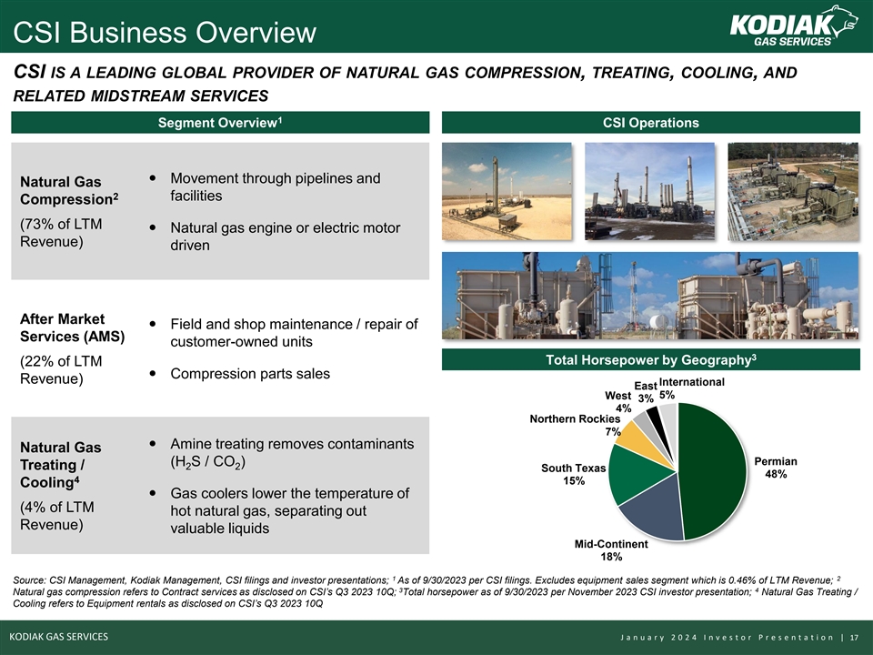 Key Transaction Benefits ❑ Enhanced cash flows help achieve leverage goal of 3.5x by year end 2025 Attractive ❑ Over $20 million of high-confidence expected annual cost synergies Transaction ❑ Transaction value of ~6.6x CSI LTM Q3 2023 Adjusted EBITDA, excluding synergies Economics ❑ Expected to be accretive to Discretionary Cash Flow and Free Cash Flow per share ❑ Increases size and scale of fleet Complementary ❑ Opportunity to generate higher utilization across CSI’s fleet Compression Assets ❑ Investments in large HP units and divestiture of small HP units have high-graded CSI's fleet Deepen Geographic ❑ Presence in the Permian Basin and Eagle Ford Shale augments Kodiak’s existing footprint Footprint and ❑ Fixed-revenue contracts with blue-chip customers Expand Customer ❑ Limited customer overlap Base Natural Extension of ❑ Broader service offerings via CSI’s natural gas treating / cooling and aftermarket services Diversified Service ❑ Potential for cross-selling opportunities Offerings KODIAK GAS SERVICES J a n u a r y 2 0 2 4 I n v e s t o r P r e s e n t a t i o n | 16