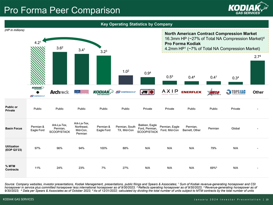 Pro Forma Horsepower CSI CSI 70k HP Northern Rockies 71k HP 2 Other 336k HP Kodiak 211k HP Kodiak 266k HP 140k HP CSI CSI 190k HP Mid-Continent 48k HP International 295k HP Kodiak 48k HP Kodiak 105k HP None CSI CSI 157k HP Eagle Ford 507k HP Permian 583k HP Kodiak 2,779k HP Kodiak Kodiak Headquarters 427k HP 2,272k HP CSI Headquarters Pro Forma HP by Geography Mid- International Other 1% Continent 5% 7% CSI Northern 1,043k HP Total Revenue-Generating Rockies 8% 1 Kodiak 4,253k HP 3,210k HP Eagle Ford 14% Permian 65% 1 2 Reflects revenue-generating horsepower for Kodiak and operating horsepower plus committed horsepower for CSI as of 9/30/2023; Other category comprised of CSI figures identified as East and West, and Kodiak figures identified as Appalachia, Haynesville, and Other KODIAK GAS SERVICES J a n u a r y 2 0 2 4 I n v e s t o r P r e s e n t a t i o n | 18