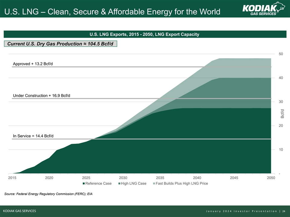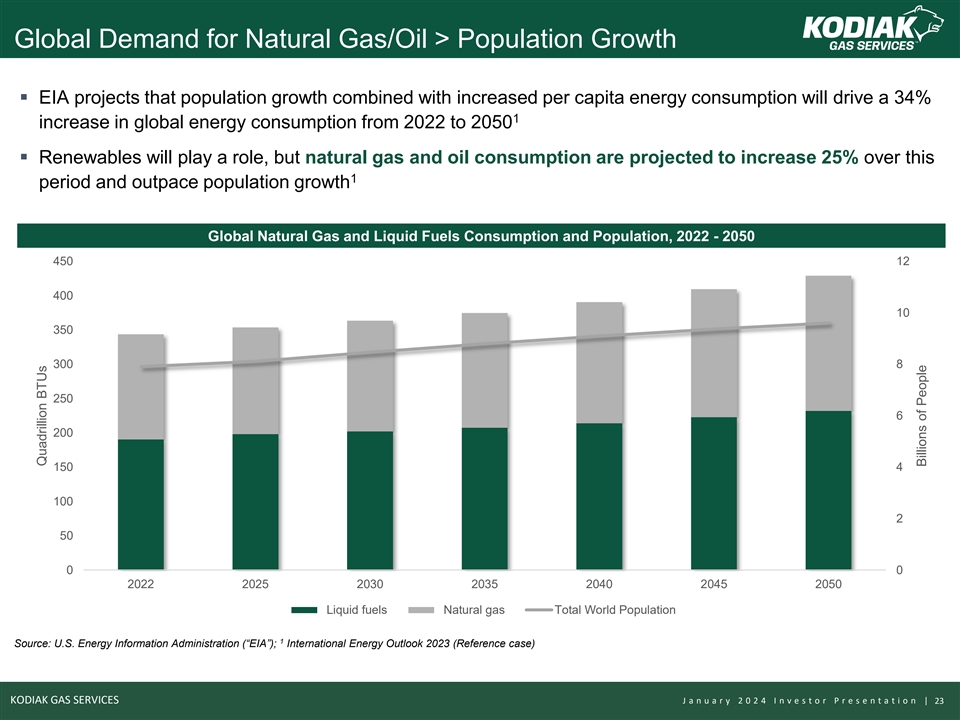 Global Demand for Natural Gas/Oil > Population Growth ▪ EIA projects that population growth combined with increased per capita energy consumption will drive a 34% 1 increase in global energy consumption from 2022 to 2050 ▪ Renewables will play a role, but natural gas and oil consumption are projected to increase 25% over this 1 period and outpace population growth Global Natural Gas and Liquid Fuels Consumption and Population, 2022 - 2050 450 12 400 10 350 300 8 250 6 200 150 4 100 2 50 0 0 2022 2025 2030 2035 2040 2045 2050 Liquid fuels Natural gas Total World Population 1 Source: U.S. Energy Information Administration (“EIA”); International Energy Outlook 2023 (Reference case) KODIAK GAS SERVICES J a n u a r y 2 0 2 4 I n v e s t o r P r e s e n t a t i o n | 23 Quadrillion BTUs Billions of People