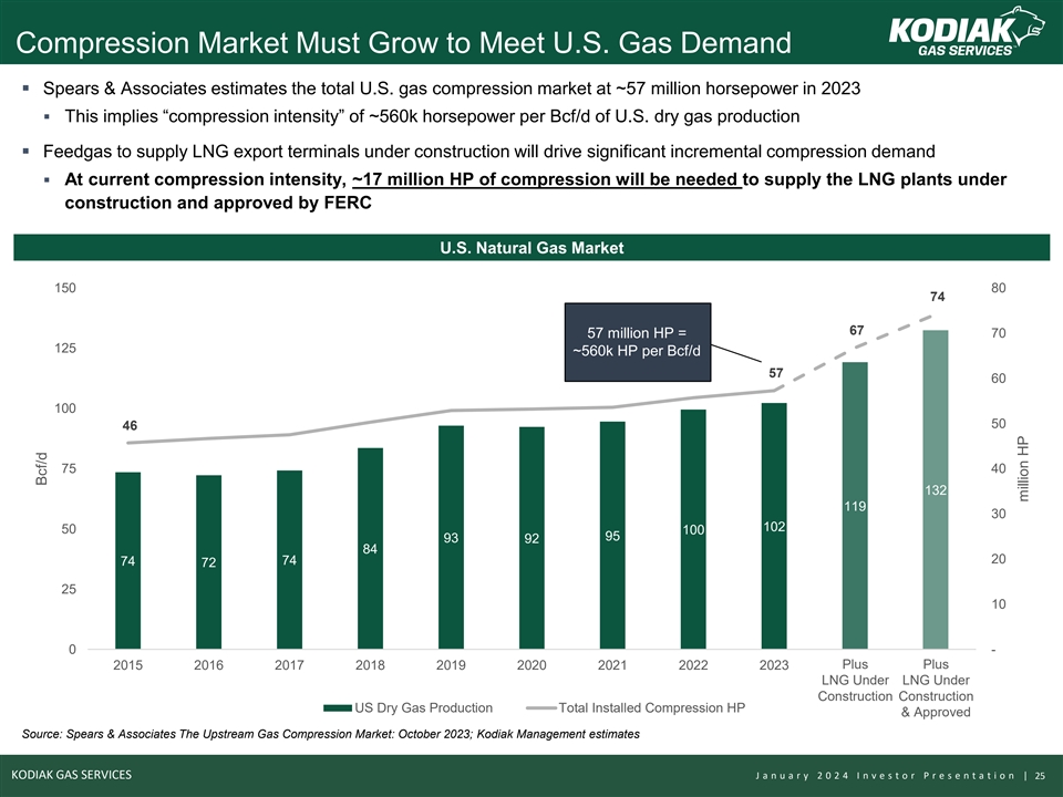 U.S. LNG – Clean, Secure & Affordable Energy for the World U.S. LNG Exports, 2015 - 2050, LNG Export Capacity Current U.S. Dry Gas Production ≈ 104.5 Bcf/d 50 Approved + 13.2 Bcf/d 40 Under Construction + 16.9 Bcf/d 30 20 In Service = 14.4 Bcf/d 10 - 2015 2020 2025 2030 2035 2040 2045 2050 Reference Case High LNG Case Fast Builds Plus High LNG Price Source: Federal Energy Regulatory Commission (FERC); EIA KODIAK GAS SERVICES J a n u a r y 2 0 2 4 I n v e s t o r P r e s e n t a t i o n | 24 Bcf/d