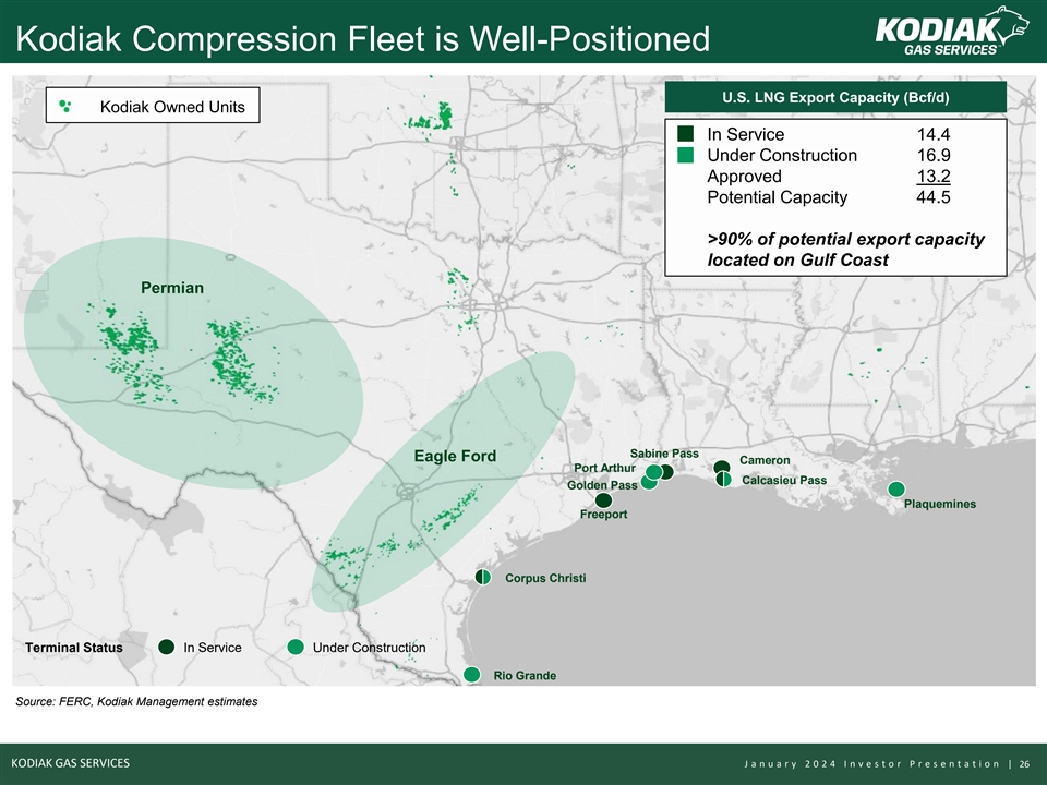 Compression Market Must Grow to Meet U.S. Gas Demand ▪ Spears & Associates estimates the total U.S. gas compression market at ~57 million horsepower in 2023 ▪ This implies “compression intensity” of ~560k horsepower per Bcf/d of U.S. dry gas production ▪ Feedgas to supply LNG export terminals under construction will drive significant incremental compression demand ▪ At current compression intensity, ~17 million HP of compression will be needed to supply the LNG plants under construction and approved by FERC U.S. Natural Gas Market 150 80 74 67 57 million HP = 70 125 ~560k HP per Bcf/d 57 60 100 50 46 75 40 132 119 30 102 50 100 95 93 92 84 20 74 74 72 25 10 0 - Plus Plus 2015 2016 2017 2018 2019 2020 2021 2022 2023 Existing + Existing + L LNG NG Un Und de er r L LNG NG Un Und de er r Con Cons stru truc cti tio on n Con Cons stru truc cti tio on n US Dry Gas Production Total Installed Compression HP & Approved & Approved Source: Spears & Associates The Upstream Gas Compression Market: October 2023; Kodiak Management estimates KODIAK GAS SERVICES J a n u a r y 2 0 2 4 I n v e s t o r P r e s e n t a t i o n | 25 Bcf/d million HP