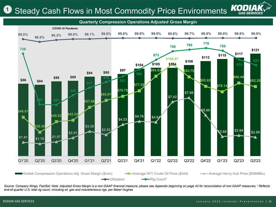 Key Credit Highlights 1 Stable cash flows through commodity price cycles 2 Contract structure contributes to cash flow visibility Differentiated operating approach results in longer-term relationships with blue chip 3 customers 4 Extensive fleet provides strong asset coverage for bondholders 5 Conservatively capitalized with a focus on living within cash flow Experienced management team supporting one of the industry’s most capable 6 workforces Source: Kodiak Management KODIAK GAS SERVICES J a n u a r y 2 0 2 4 I n v e s t o r P r e s e n t a t i o n | 28