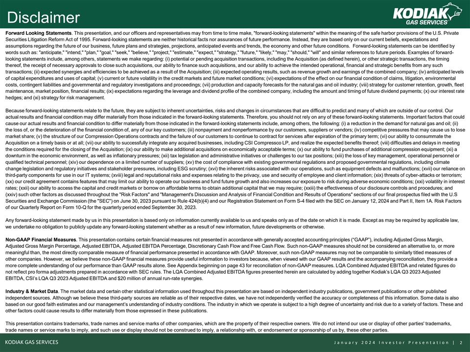 Disclaimer Forward Looking Statements. This presentation, and our officers and representatives may from time to time make, forward-looking statements within the meaning of the safe harbor provisions of the U.S. Private Securities Litigation Reform Act of 1995. Forward-looking statements are neither historical facts nor assurances of future performance. Instead, they are based only on our current beliefs, expectations and assumptions regarding the future of our business, future plans and strategies, projections, anticipated events and trends, the economy and other future conditions. Forward-looking statements can be identified by words such as: anticipate, intend, plan, goal, seek, believe, project, estimate, expect, strategy, future, likely, may, should, will and similar references to future periods. Examples of forward- looking statements include, among others, statements we make regarding: (i) potential or pending acquisition transactions, including the Acquisition (as defined herein), or other strategic transactions, the timing thereof, the receipt of necessary approvals to close such acquisitions, our ability to finance such acquisitions, and our ability to achieve the intended operational, financial and strategic benefits from any such transactions; (ii) expected synergies and efficiencies to be achieved as a result of the Acquisition; (iii) expected operating results, such as revenue growth and earnings of the combined company; (iv) anticipated levels of capital expenditures and uses of capital; (v) current or future volatility in the credit markets and future market conditions; (vi) expectations of the effect on our financial condition of claims, litigation, environmental costs, contingent liabilities and governmental and regulatory investigations and proceedings; (vii) production and capacity forecasts for the natural gas and oil industry; (viii) strategy for customer retention, growth, fleet maintenance, market position, financial results; (ix) expectations regarding the leverage and dividend profile of the combined company, including the amount and timing of future dividend payments; (x) our interest rate hedges; and (xi) strategy for risk management. Because forward-looking statements relate to the future, they are subject to inherent uncertainties, risks and changes in circumstances that are difficult to predict and many of which are outside of our control. Our actual results and financial condition may differ materially from those indicated in the forward-looking statements. Therefore, you should not rely on any of these forward-looking statements. Important factors that could cause our actual results and financial condition to differ materially from those indicated in the forward-looking statements include, among others, the following: (i) a reduction in the demand for natural gas and oil; (ii) the loss of, or the deterioration of the financial condition of, any of our key customers; (iii) nonpayment and nonperformance by our customers, suppliers or vendors; (iv) competitive pressures that may cause us to lose market share; (v) the structure of our Compression Operations contracts and the failure of our customers to continue to contract for services after expiration of the primary term; (vi) our ability to consummate the Acquisition on a timely basis or at all; (vii) our ability to successfully integrate any acquired businesses, including CSI Compressco LP, and realize the expected benefits thereof; (viii) difficulties and delays in meeting the conditions required for the closing of the Acquisition; (ix) our ability to make additional acquisitions on economically acceptable terms; (x) our ability to fund purchases of additional compression equipment; (xi) a downturn in the economic environment, as well as inflationary pressures; (xii) tax legislation and administrative initiatives or challenges to our tax positions; (xiii) the loss of key management, operational personnel or qualified technical personnel; (xiv) our dependence on a limited number of suppliers; (xv) the cost of compliance with existing governmental regulations and proposed governmental regulations, including climate change legislation and regulatory initiatives and stakeholder pressures, including ESG scrutiny; (xvi) the inherent risks associated with our operations, such as equipment defects and malfunctions; (xvii) our reliance on third-party components for use in our IT systems; (xviii) legal and reputational risks and expenses relating to the privacy, use and security of employee and client information; (xix) threats of cyber-attacks or terrorism; (xx) our credit agreement contains features that may limit our ability to operate our business and fund future growth and also increases our exposure to risk during adverse economic conditions; (xxi) volatility in interest rates; (xxii) our ability to access the capital and credit markets or borrow on affordable terms to obtain additional capital that we may require; (xxiii) the effectiveness of our disclosure controls and procedures; and (xxiv) such other factors as discussed throughout the Risk Factors and Management's Discussion and Analysis of Financial Condition and Results of Operations sections of our final prospectus filed with the U.S Securities and Exchange Commission (the SEC ) on June 30, 2023 pursuant to Rule 424(b)(4) and our Registration Statement on Form S-4 filed with the SEC on January 12, 2024 and Part II, Item 1A. Risk Factors of our Quarterly Report on Form 10-Q for the quarterly period ended September 30, 2023. Any forward-looking statement made by us in this presentation is based only on information currently available to us and speaks only as of the date on which it is made. Except as may be required by applicable law, we undertake no obligation to publicly update any forward-looking statement whether as a result of new information, future developments or otherwise. Non-GAAP Financial Measures. This presentation contains certain financial