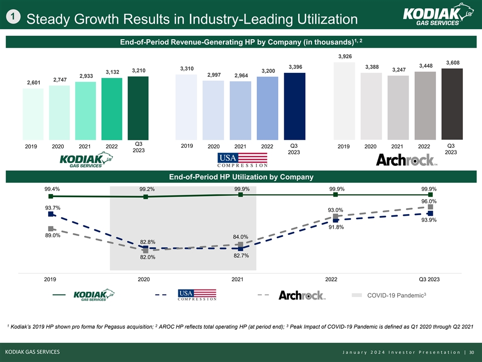 1 Steady Cash Flows in Most Commodity Price Environments Quarterly Compression Operations Adjusted Gross Margin COVID-19 Pandemic 99.6% 99.8% 99.9% 99.9% 99.6% 99.7% 99.9% 99.9% 99.9% 99.9% 99.0% 99.0% 99.1% 900 98.3% 96.8% 1 1 1 779 765 1 755 750 1 728 $121 1 1 14.0 $117 120 673 $115 1 700 $112 1 $108.87 623 1 $108 1 $105 $104 674 $104 1 12.0 1 $94.53 $97 $93.75 10 1 0 $95 $94 1 586 1 $86.49 $89 $88 470 500 1 $86 521 $82.62 $82.25 $84 1 417 10.0 1 $77.29 $76.14 1 80 1 $70.75 348 1 $7.98 $65.97 1 1 $7.42 8.0 1 265 261 300 $57.68 1 0 60 0 0 $5.60 $46.01 0 6.0 $42.52 0 $40.82 $4.76 $4.64 0 $4.33 0 40 0 100 0 $28.30 $3.39 4.0 0 $2.93 0 $2.84 $2.68 $2.59 0 $2.51 0 $1.97 $1.91 0 $1.70 20 0 2.0 0 -100 0 0 0 0 0 0 - 0 0 Q1'20 Q2'20 Q3'20 Q4'20 Q1'21 Q2'21 Q3'21 Q4'21 Q1'22 Q2'22 Q3'22 Q4'22 Q1'23 Q2'23 Q3'23 0 0 -300 Kodiak Compression Operations Adj. Gross Margin ($mm) Average WTI Crude Oil Price ($/bbl) Average Henry Hub Price ($/MMBtu) 1 Utilization Rig Count 1 Source: Company filings, FactSet; Note: Adjusted Gross Margin is a non-GAAP financial measure; please see Appendix beginning on page 43 for reconciliation of non-GAAP measures; Reflects end-of-quarter U.S. total rig count, including oil, gas and miscellaneous rigs, per Baker Hughes KODIAK GAS SERVICES J a n u a r y 2 0 2 4 I n v e s t o r P r e s e n t a t i o n | 29
