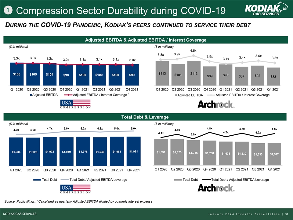 1 Steady Growth Results in Industry-Leading Utilization 1, 2 End-of-Period Revenue-Generating HP by Company (in thousands) 3,926 3,608 3,448 3,396 3,388 3,310 3,247 3,210 3,200 3,132 2,997 2,933 2,964 2,747 2,601 Q3 2019 Q3 Q3 2019 2020 2021 2022 2020 2021 2022 2019 2020 2021 2022 2023 2023 2023 End-of-Period HP Utilization by Company 99.4% 99.2% 99.9% 99.9% 99.9% 96.0% 93.7% 93.0% 93.9% 91.8% 89.0% 84.0% 82.8% 82.7% 82.0% 2019 2020 2021 2022 Q3 2023 3 USAC AROC COVID-19 Pandemic 1 2 3 Kodiak’s 2019 HP shown pro forma for Pegasus acquisition; AROC HP reflects total operating HP (at period end); Peak Impact of COVID-19 Pandemic is defined as Q1 2020 through Q2 2021 KODIAK GAS SERVICES J a n u a r y 2 0 2 4 I n v e s t o r P r e s e n t a t i o n | 30