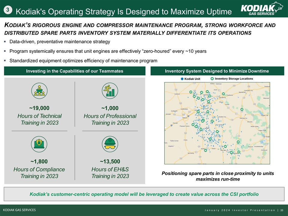 2 Contract Structure Supports Cash Flow Visibility 1 Fixed monthly revenue with multi-year terms 2 Annual Producer Price Index rate adjustments 3 Advance billing improves working capital cycle 4 98% mechanical availability guarantee 5 Customer bears mobilization and demobilization costs Kodiak Status Quo Percent of Month-to-Month Contracts Kodiak Status Quo Weighted Average Contract Term (months) 35 7% 2023 Typical Contract Term: 3–5 years 20 93% HP on Month-to-Month Contract HP with Remaining Contract Term Remaining Contract Term Initial Contract Term KODIAK GAS SERVICES J a n u a r y 2 0 2 4 I n v e s t o r P r e s e n t a t i o n | 32
