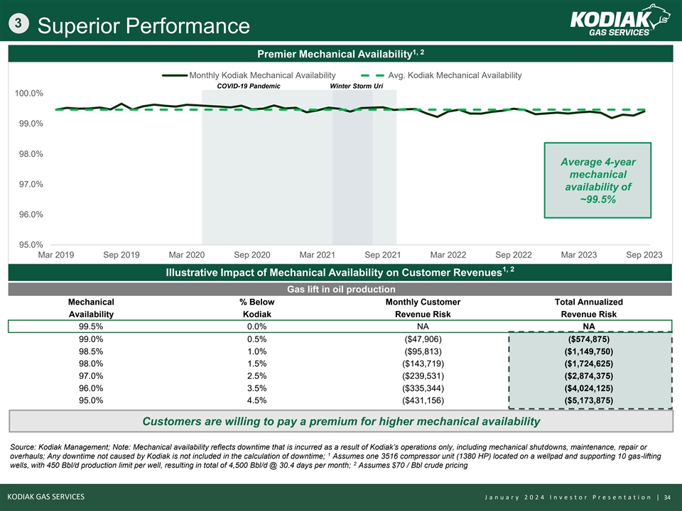 3 Superior Performance 1, 2 Premier Mechanical Availability Monthly Kodiak Mechanical Availability Avg. Kodiak Mechanical Availability COVID-19 Pandemic Winter Storm Uri 100.0% 99.0% 98.0% Average 4-year mechanical 97.0% availability of ~99.5% 96.0% 95.0% Mar 2019 Sep 2019 Mar 2020 Sep 2020 Mar 2021 Sep 2021 Mar 2022 Sep 2022 Mar 2023 Sep 2023 1, 2 Illustrative Impact of Mechanical Availability on Customer Revenues Gas lift in oil production Mechanical % Below Monthly Customer Total Annualized Availability Kodiak Revenue Risk Revenue Risk 99.5% 0.0% NA NA 99.0% 0.5% ($47,906) ($574,875) 98.5% 1.0% ($95,813) ($1,149,750) 98.0% 1.5% ($143,719) ($1,724,625) 97.0% 2.5% ($239,531) ($2,874,375) 96.0% 3.5% ($335,344) ($4,024,125) 95.0% 4.5% ($431,156) ($5,173,875) Customers are willing to pay a premium for higher mechanical availability Source: Kodiak Management; Note: Mechanical availability reflects downtime that is incurred as a result of Kodiak’s operations only, including mechanical shutdowns, maintenance, repair or 1 overhauls; Any downtime not caused by Kodiak is not included in the calculation of downtime; Assumes one 3516 compressor unit (1380 HP) located on a wellpad and supporting 10 gas-lifting 2 wells, with 450 Bbl/d production limit per well, resulting in total of 4,500 Bbl/d @ 30.4 days per month; Assumes $70 / Bbl crude pricing KODIAK GAS SERVICES J a n u a r y 2 0 2 4 I n v e s t o r P r e s e n t a t i o n | 34