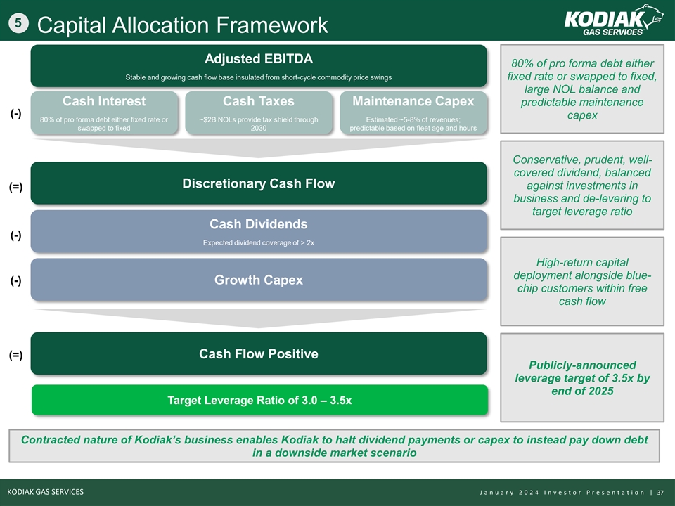 4 Fleet Detail – Asset Coverage EXTENSIVE PRO FORMA FLEET PROVIDES STRONG ASSET COVERAGE TO BONDHOLDERS ($ in millions) 1 A/R 172 Current 1 Assets Inventories 117 2 Fleet Detail 2,3,4 Gross Fleet (Orderly Liquidation Value – In Place) 3,554 Units HP Fleet Less: Liquidation Expenses (89) 6,946 4,138,885 Compression 2,3,4 Net Fleet (Orderly Liquidation Value – In Place) 3,465 Production / Processing 562 N/A & Treating Total Net Asset Base 3,754 Asset 5 Coverage Total Debt 2,471 Asset Coverage 1.5x 92.3% of Kodiak’s pro forma asset base is comprised of its high-quality, long-lived compression fleet 1 2 3 Per Company filings, as of 9/30/2023; Per Tiger Asset Intelligent Compression Fleet Appraisal Reports, as of 6/30/2022 (KGS) and 5/31/2023 (CCLP); Orderly Liquidation Value – In Place (OLV-IP) is an asset-based lending concept defined as an estimated amount the target asset could typically realize if sold in a bundled, privately negotiated, competitive sale over a 6- 4 5 to 12-month time period; Includes both Compression and Production/Processing & Treating Fleet; Please refer to page 7 for detail KODIAK GAS SERVICES J a n u a r y 2 0 2 4 I n v e s t o r P r e s e n t a t i o n | 36