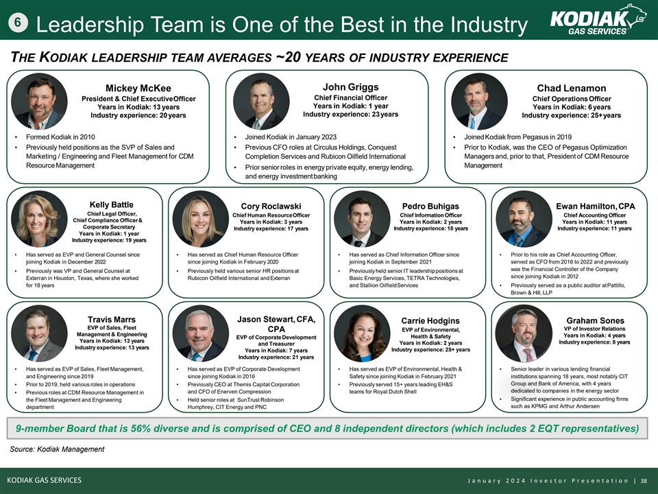 5 Capital Allocation Framework Adjusted EBITDA 80% of pro forma debt either Stable and growing cash flow base insulated from short-cycle commodity price swings fixed rate or swapped to fixed, large NOL balance and Cash Interest Cash Taxes Maintenance Capex predictable maintenance (-) capex 80% of pro forma debt either fixed rate or ~$2B NOLs provide tax shield through Estimated ~5-8% of revenues; swapped to fixed 2030 predictable based on fleet age and hours Conservative, prudent, well- covered dividend, balanced Discretionary Cash Flow against investments in (=) business and de-levering to target leverage ratio Cash Dividends (-) Expected dividend coverage of > 2x High-return capital deployment alongside blue- (-) Growth Capex chip customers within free cash flow (=) Cash Flow Positive Publicly-announced leverage target of 3.5x by end of 2025 Target Leverage Ratio of 3.0 – 3.5x Contracted nature of Kodiak’s business enables Kodiak to halt dividend payments or capex to instead pay down debt in a downside market scenario KODIAK GAS SERVICES J a n u a r y 2 0 2 4 I n v e s t o r P r e s e n t a t i o n | 37