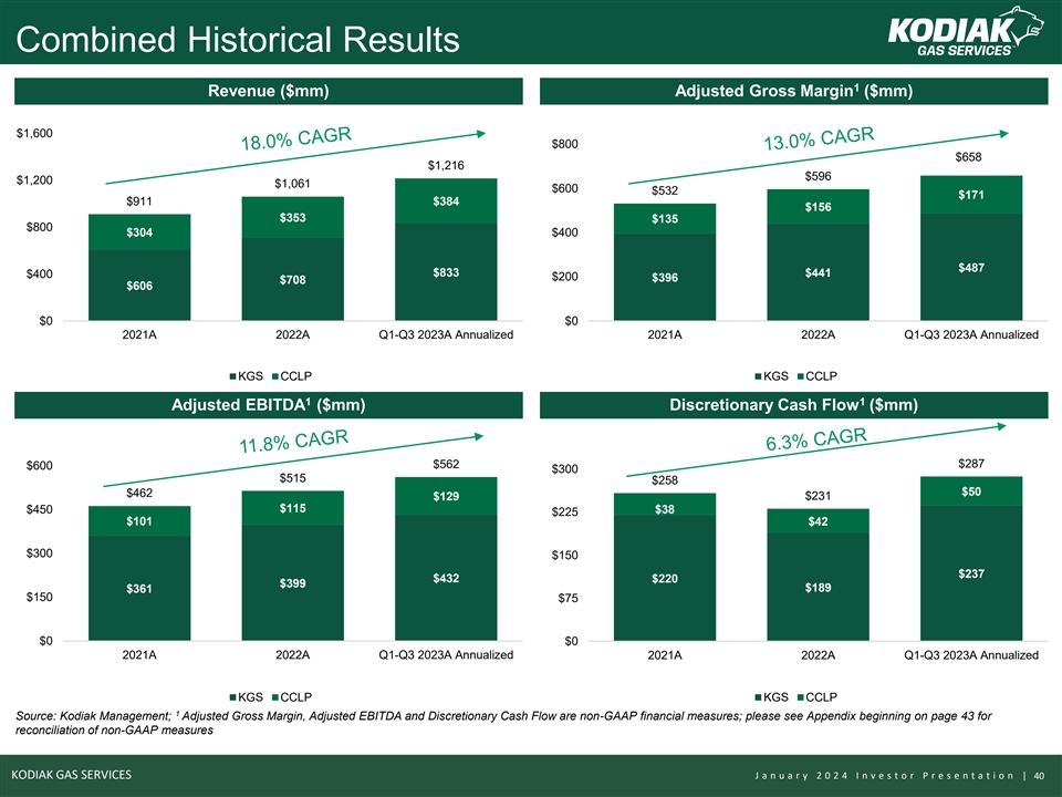 Combined Historical Results 1 Revenue ($mm) Adjusted Gross Margin ($mm) $1,600 $800 $658 $1,216 $596 $1,200 $1,061 $600 $532 $171 $911 $384 $156 $353 $135 $800 $304 $400 $487 $400 $833 $441 $200 $396 $708 $606 $0 $0 2021A 2022A Q1-Q3 2023A Annualized 2021A 2022A Q1-Q3 2023A Annualized KGS CCLP KGS CCLP 1 1 Adjusted EBITDA ($mm) Discretionary Cash Flow ($mm) $562 $287 $600 $300 $515 $258 $50 $462 $129 $231 $115 $450 $38 $225 $101 $42 $300 $150 $237 $432 $220 $399 $189 $361 $150 $75 $0 $0 2021A 2022A Q1-Q3 2023A Annualized 2021A 2022A Q1-Q3 2023A Annualized KGS CCLP KGS CCLP 1 Source: Kodiak Management; Adjusted Gross Margin, Adjusted EBITDA and Discretionary Cash Flow are non-GAAP financial measures; please see Appendix beginning on page 43 for reconciliation of non-GAAP measures KODIAK GAS SERVICES J a n u a r y 2 0 2 4 I n v e s t o r P r e s e n t a t i o n | 40