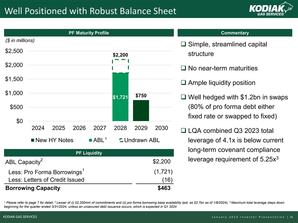 Well Positioned with Robust Balance Sheet PF Maturity Profile Commentary ($ in millions) ❑ Simple, streamlined capital $2,500 structure $2,200 $2,000 ❑ No near-term maturities $1,500 ❑ Ample liquidity position $1,000 $750 $1,721 ❑ Well hedged with $1.2bn in swaps $500 (80% of pro forma debt either fixed rate or swapped to fixed) $0 2024 2025 2026 2027 2028 2029 2030 ❑ LQA combined Q3 2023 total 1 New HY Notes ABL Undrawn ABL leverage of 4.1x is below current long-term covenant compliance PF Liquidity 3 2 leverage requirement of 5.25x $2,200 ABL Capacity 1 (1,721) Less: Pro Forma Borrowings Less: Letters of Credit Issued (16) Borrowing Capacity $463 1 2 3 Please refer to page 7 for detail; Lesser of (i) $2,200mm of commitments and (ii) pro forma borrowing base availability (est. as $2.7bn as of 1/8/2024); Maximum total leverage steps down beginning for the quarter ended 3/31/2024, unless an unsecured debt issuance occurs, which is expected in Q1 2024 KODIAK GAS SERVICES J a n u a r y 2 0 2 4 I n v e s t o r P r e s e n t a t i o n | 41