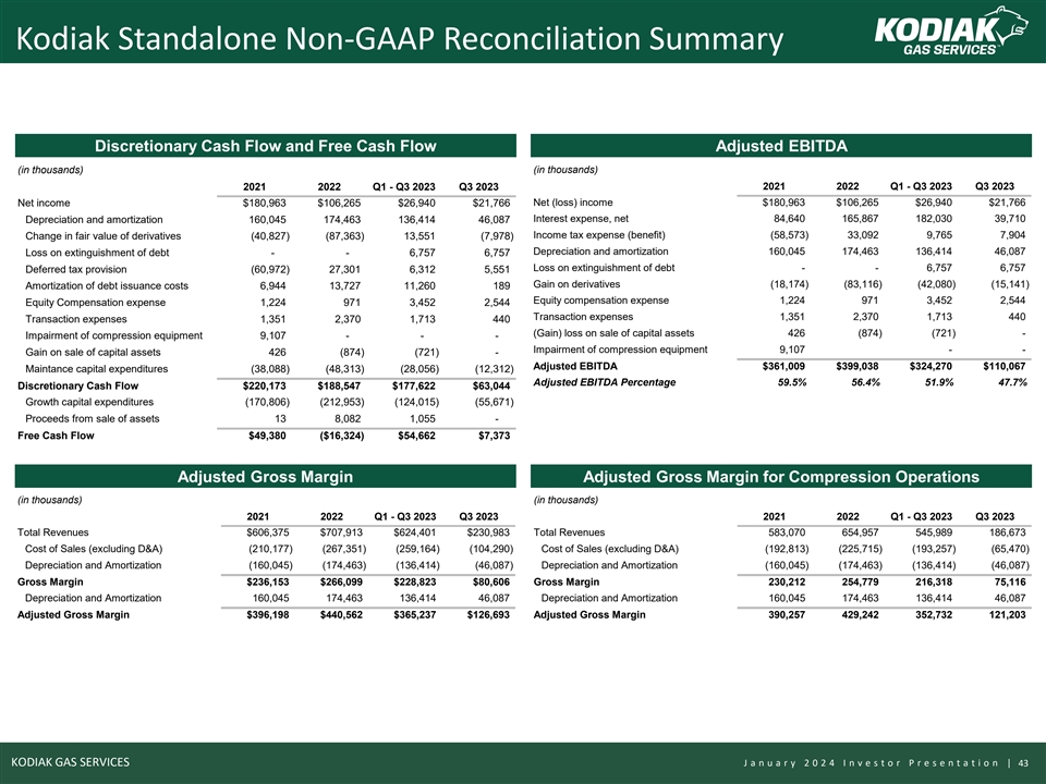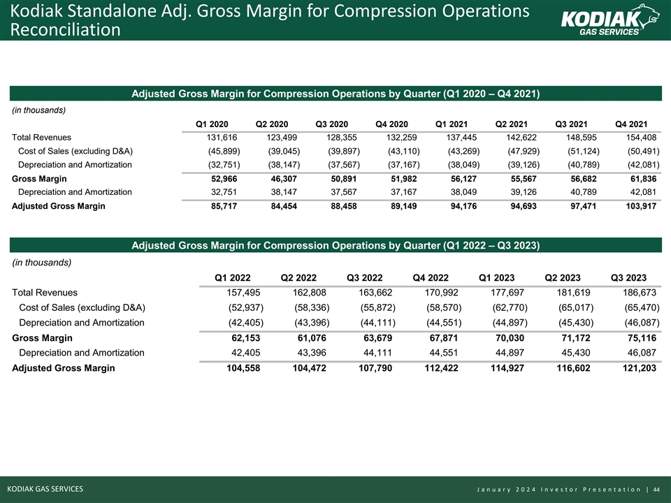 Kodiak Standalone Non-GAAP Reconciliation Summary Discretionary Cash Flow and Free Cash Flow Adjusted EBITDA (in thousands) (in thousands) 2021 2022 Q1 - Q3 2023 Q3 2023 2021 2022 Q1 - Q3 2023 Q3 2023 Net income $180,963 $106,265 $26,940 $21,766 Net (loss) income $180,963 $106,265 $26,940 $21,766 Interest expense, net 84,640 165,867 182,030 39,710 Depreciation and amortization 160,045 174,463 136,414 46,087 Income tax expense (benefit) (58,573) 33,092 9,765 7,904 Change in fair value of derivatives ( 40,827) ( 87,363) 13,551 ( 7,978) Depreciation and amortization 160,045 174,463 136,414 46,087 Loss on extinguishment of debt - - 6,757 6,757 Loss on extinguishment of debt - - 6,757 6,757 Deferred tax provision ( 60,972) 27,301 6,312 5,551 Gain on derivatives (18,174) (83,116) (42,080) (15,141) Amortization of debt issuance costs 6,944 13,727 11,260 189 Equity compensation expense 1,224 971 3,452 2,544 Equity Compensation expense 1,224 971 3,452 2,544 Transaction expenses 1,351 2,370 1,713 440 Transaction expenses 1,351 2,370 1,713 440 (Gain) loss on sale of capital assets 426 (874) (721) - Impairment of compression equipment 9,107 - - - Impairment of compression equipment 9,107 - - Gain on sale of capital assets 426 ( 874) ( 721) - Adjusted EBITDA $361,009 $399,038 $324,270 $110,067 Maintance capital expenditures ( 38,088) ( 48,313) ( 28,056) ( 12,312) Adjusted EBITDA Percentage 59.5% 56.4% 51.9% 47.7% Discretionary Cash Flow $220,173 $188,547 $177,622 $63,044 Growth capital expenditures ( 170,806) ( 212,953) ( 124,015) ( 55,671) Proceeds from sale of assets 13 8,082 1,055 - Free Cash Flow $49,380 ($16,324) $54,662 $7,373 Adjusted Gross Margin Adjusted Gross Margin for Compression Operations (in thousands) (in thousands) 2021 2022 Q1 - Q3 2023 Q3 2023 2021 2022 Q1 - Q3 2023 Q3 2023 Total Revenues $606,375 $707,913 $624,401 $230,983 Total Revenues 583,070 654,957 545,989 186,673 Cost of Sales (excluding D&A) (210,177) (267,351) (259,164) (104,290) Cost of Sales (excluding D&A) ( 192,813) ( 225,715) ( 193,257) ( 65,470) Depreciation and Amortization (160,045) (174,463) (136,414) (46,087) Depreciation and Amortization ( 160,045) ( 174,463) ( 136,414) ( 46,087) Gross Margin $236,153 $266,099 $228,823 $80,606 Gross Margin 230,212 254,779 216,318 75,116 Depreciation and Amortization 160,045 174,463 136,414 46,087 Depreciation and Amortization 160,045 174,463 136,414 46,087 Adjusted Gross Margin $396,198 $440,562 $365,237 $126,693 Adjusted Gross Margin 390,257 429,242 352,732 121,203 KODIAK GAS SERVICES J a n u a r y 2 0 2 4 I n v e s t o r P r e s e n t a t i o n | 43