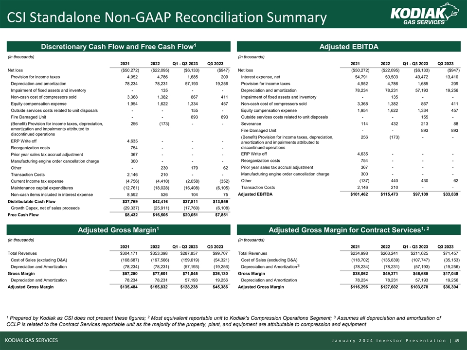 Kodiak Standalone Adj. Gross Margin for Compression Operations Reconciliation Adjusted Gross Margin for Compression Operations by Quarter (Q1 2020 – Q4 2021) (in thousands) Q1 2020 Q2 2020 Q3 2020 Q4 2020 Q1 2021 Q2 2021 Q3 2021 Q4 2021 Total Revenues 131,616 123,499 128,355 132,259 137,445 142,622 148,595 154,408 Cost of Sales (excluding D&A) (45,899) (39,045) (39,897) (43,110) (43,269) (47,929) (51,124) (50,491) Depreciation and Amortization (32,751) (38,147) (37,567) (37,167) (38,049) (39,126) (40,789) (42,081) Gross Margin 52,966 46,307 50,891 51,982 56,127 55,567 56,682 61,836 Depreciation and Amortization 32,751 38,147 37,567 37,167 38,049 39,126 40,789 42,081 Adjusted Gross Margin 85,717 84,454 88,458 89,149 94,176 94,693 97,471 103,917 Adjusted Gross Margin for Compression Operations by Quarter (Q1 2022 – Q3 2023) (in thousands) Q1 2022 Q2 2022 Q3 2022 Q4 2022 Q1 2023 Q2 2023 Q3 2023 Total Revenues 157,495 162,808 163,662 170,992 177,697 181,619 186,673 Cost of Sales (excluding D&A) (52,937) (58,336) (55,872) (58,570) (62,770) (65,017) (65,470) Depreciation and Amortization (42,405) (43,396) (44,111) (44,551) (44,897) (45,430) (46,087) Gross Margin 62,153 61,076 63,679 67,871 70,030 71,172 75,116 Depreciation and Amortization 42,405 43,396 44,111 44,551 44,897 45,430 46,087 Adjusted Gross Margin 104,558 104,472 107,790 112,422 114,927 116,602 121,203 KODIAK GAS SERVICES J a n u a r y 2 0 2 4 I n v e s t o r P r e s e n t a t i o n | 44