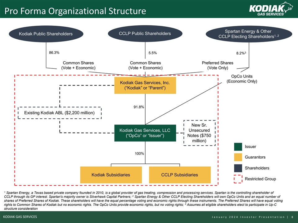 Transaction Overview And Capitalization Summary KODIAK WILL REMAIN CONSERVATIVELY CAPITALIZED FOLLOWING THE ACQUISITION Sources and Uses Sources Uses ($ in millions) Amount ($ in millions) Amount Issuance of Kodiak Shares for CCLP Equity (as of 1/18/2024) $266 Acquire CCLP Equity (as of 1/18/2024) $266 1,2 New Senior Notes 750 643 Repay CCLP Debt Repay Kodiak ABL Facility 68 Executive Severance 6 Fees & Expenses 33 Total Sources $1,016 Total Uses $1,016 Pro Forma Capitalization 9/30/2023 9/30/2023 9/30/2023 5 ($ in millions) Kodiak CCLP Adj. Combined Cash & Cash Equivalents $6 $16 - $22 Kodiak ABL due 2028 ($2,200mm) 1,789 - (68) 1,721 1,2 - 643 (643) - CCLP Debt due 2025 and 2026 Total Secured Debt $1,789 $643 ($711) $1,721 New Senior Notes due 2029 - - 750 750 Total Debt $1,789 $643 $39 $2,471 3 1,703 247 19 1,968 Common Equity (as of 1/18/2024) Total Capitalization $3,492 $890 $57 $4,439 Operating Statistics 4 $440 135 $576 LQA Combined Adj. EBITDA Run-Rate Synergies 20 $20 LQA Combined Adj. EBITDA $596 Credit Statistics Net Secured Debt / LQA Combined Adj. EBITDA 4.0x 2.9x Net Debt / LQA Combined Adj. EBITDA 4.0x 4.1x 1 2 Includes breakage costs of approximately $8.6mm; To the extent the Senior Notes settle prior to the Acquisition closing date, proceeds will be used to repay Kodiak ABL borrowings. The 3 4 Kodiak ABL would be drawn to repay the CCLP debt balance on the Acquisition closing date; Assumes share price of $21.64 for KGS and $1.73 for CCLP as of 1/18/2024; See Appendix 5 beginning on page 43 for reconciliation of non-GAAP measures; LQA Combined Adj. EBITDA and related figures do not reflect pro forma adjustments prepared in accordance with SEC rules KODIAK GAS SERVICES J a n u a r y 2 0 2 4 I n v e s t o r P r e s e n t a t i o n | 7