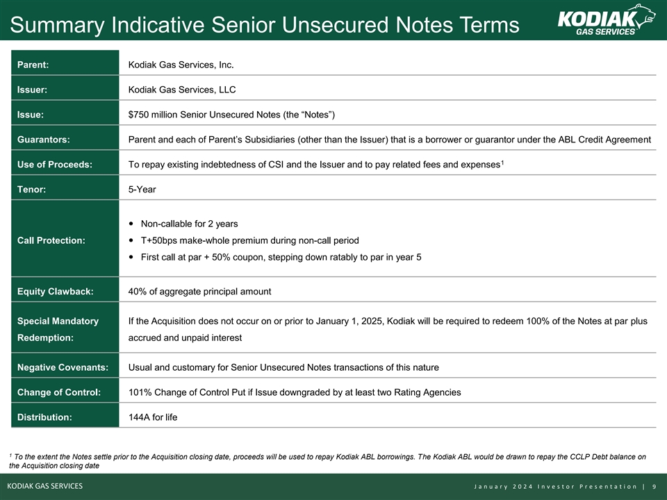Pro Forma Organizational Structure Spartan Energy & Other CCLP Public Shareholders Kodiak Public Shareholders 1, 2 CCLP Electing Shareholders 3 86.3% 5.5% 8.2% Common Shares Common Shares Preferred Shares (Vote + Economic) (Vote + Economic) (Vote Only) OpCo Units (Economic Only) Kodiak Gas Services, Inc. (“Kodiak” or “Parent”) 91.8% Existing Kodiak ABL ($2,200 million) New Sr. Kodiak Gas Services, LLC Unsecured (“OpCo” or “Issuer”) Notes ($750 million) Issuer 100% Guarantors Shareholders Kodiak Subsidiaries CCLP Subsidiaries Restricted Group 1 Spartan Energy, a Texas based private company founded in 2010, is a global provider of gas treating, compression and processing services. Spartan is the controlling shareholder of 2 CCLP through its GP interest. Spartan's majority owner is Silverhawk Capital Partners; Spartan Energy & Other CCLP Electing Shareholders will own OpCo Units and an equal number of shares of Preferred Shares of Kodiak. These shareholders will have the equal percentage voting and economic rights through these instruments. The Preferred Shares will have equal voting 3 rights to Common Shares of Kodiak but no economic rights. The OpCo Units provide economic rights, but no voting rights; Assumes all eligible shareholders elect to participate in Up-C structure consideration KODIAK GAS SERVICES J a n u a r y 2 0 2 4 I n v e s t o r P r e s e n t a t i o n | 8