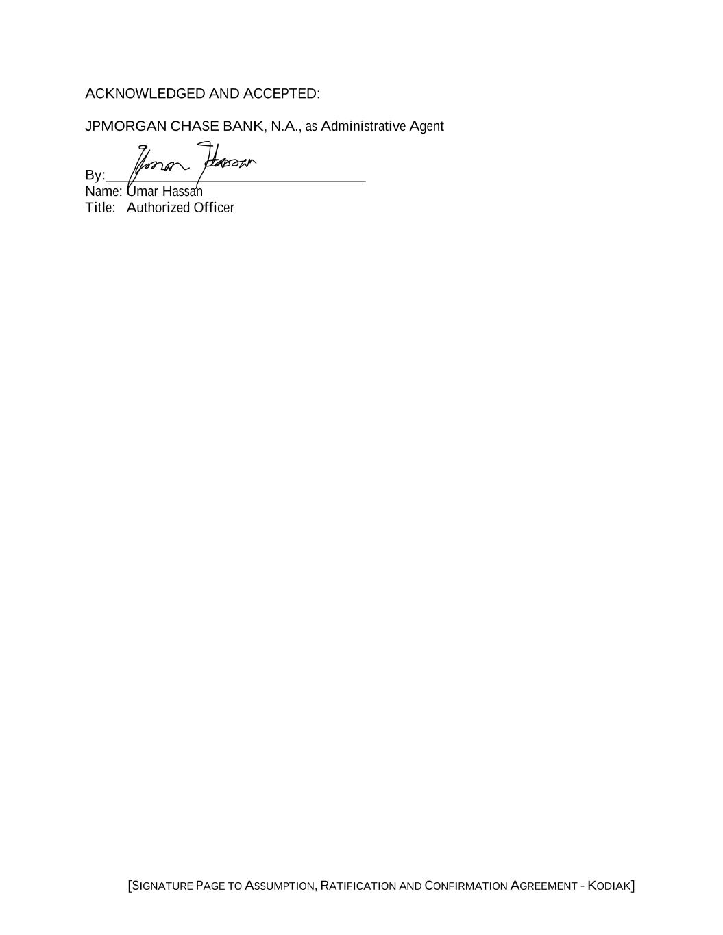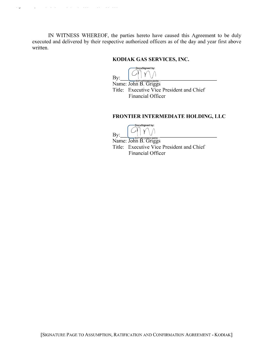 2 of the Administrative Agent and the Lenders under the Credit Agreement and the other Loan Documents with respect to the Obligors and the Collateral are preserved unimpaired. For the avoidance of doubt, it is understood and agreed that, pursuant to the Loan Documents, the Frontier Borrower remains jointly and severally liable for the Guaranteed Obligations and the Secured Obligations as a Loan Guarantor and a “Grantor” (as defined in the Security Agreement), respectively. As used herein, the term “Assigned Loan Documents” means the promissory notes executed in connection with the Credit Agreement. 2. Collateral Documents. Kodiak Corp is, simultaneously with the execution of this Agreement, executing and delivering such Collateral Documents (and such other documents and instruments) as requested by the Administrative Agent in accordance with the Credit Agreement. 3. Notice Address. The address of Kodiak Corp for purposes of Section 9.01 of the Credit Agreement is as follows: c/o Kodiak Gas Services, LLC Attn: Legal Department 15320 Hwy 105W, Suite 210 Montgomery, TX 77356 Phone No: (936) 539-3300 Email: Legal@kodiakgas.com ewan.hamilton@kodiakgas.com jason.stewart@kodiakgas.com john.griggs@kodiakgas.com 4. Defenses Waived. Kodiak Corp hereby waives acceptance by the Administrative Agent and the Lenders of the guaranty by Kodiak Corp upon the execution of this Agreement by Kodiak Corp. 5. Counterparts. This Agreement may be executed in counterparts (and by different parties hereto on different counterparts), each of which shall constitute an original, but all of which when taken together shall constitute a single contract. Delivery of an executed counterpart of a signature page of this Agreement that is an Electronic Signature transmitted by facsimile, emailed pdf. or any other electronic means that reproduces an image of an actual executed signature page shall be effective as delivery of a manually executed counterpart of this Agreement. The words “execution,” “signed,” “signature,” “delivery,” and words of like import in or relating to this Agreement shall be deemed to include Electronic Signatures, deliveries or the keeping of records in any electronic form (including deliveries by facsimile, emailed pdf. or any other electronic means that reproduces an image of an actual executed signature page), each of which shall be of the same legal effect, validity or enforceability as a manually executed signature, physical delivery thereof or the use of a paper-based recordkeeping system, as the case may be; provided that nothing herein shall require the Administrative Agent to accept Electronic Signatures in any form or format without its prior written consent and pursuant to procedures approved by it; provided, further, without limiting the foregoing, (i) to the extent the Administrative Agent has agreed to accept any Electronic Signature, the Administrative Agent and each of the Lenders shall be entitled to rely on such Electronic Signature purportedly given by or on behalf of any Obligor without further verification thereof and without any obligation to review the appearance or form of any such